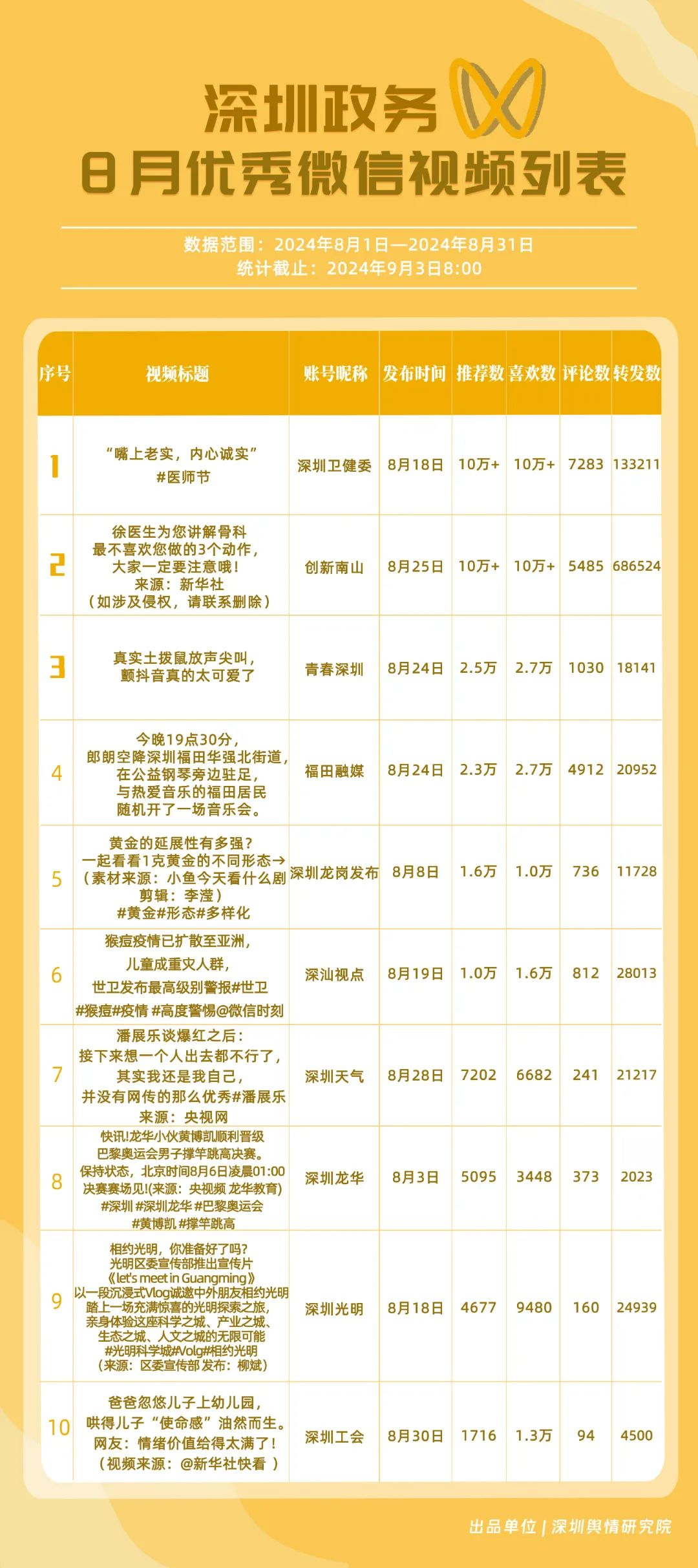 8月,“幸福福田”“深圳龍崗發(fā)布”“深圳衛(wèi)健委”“深圳龍華”“創(chuàng)新南山”“深圳人社”“深圳光明”“羅湖發(fā)布”“濱海寶安”和“坪山發(fā)布”共10個(gè)政務(wù)頭條號入選榜單。相關(guān)賬號的文章《“為愛瘋狂,怎么3天后‘下面’喜提美乃滋?”》《最新消息!價(jià)格即將調(diào)整!時(shí)間就在→》等貼近民生,傳遞實(shí)用信息,收獲了較高的閱讀量和點(diǎn)贊數(shù)。