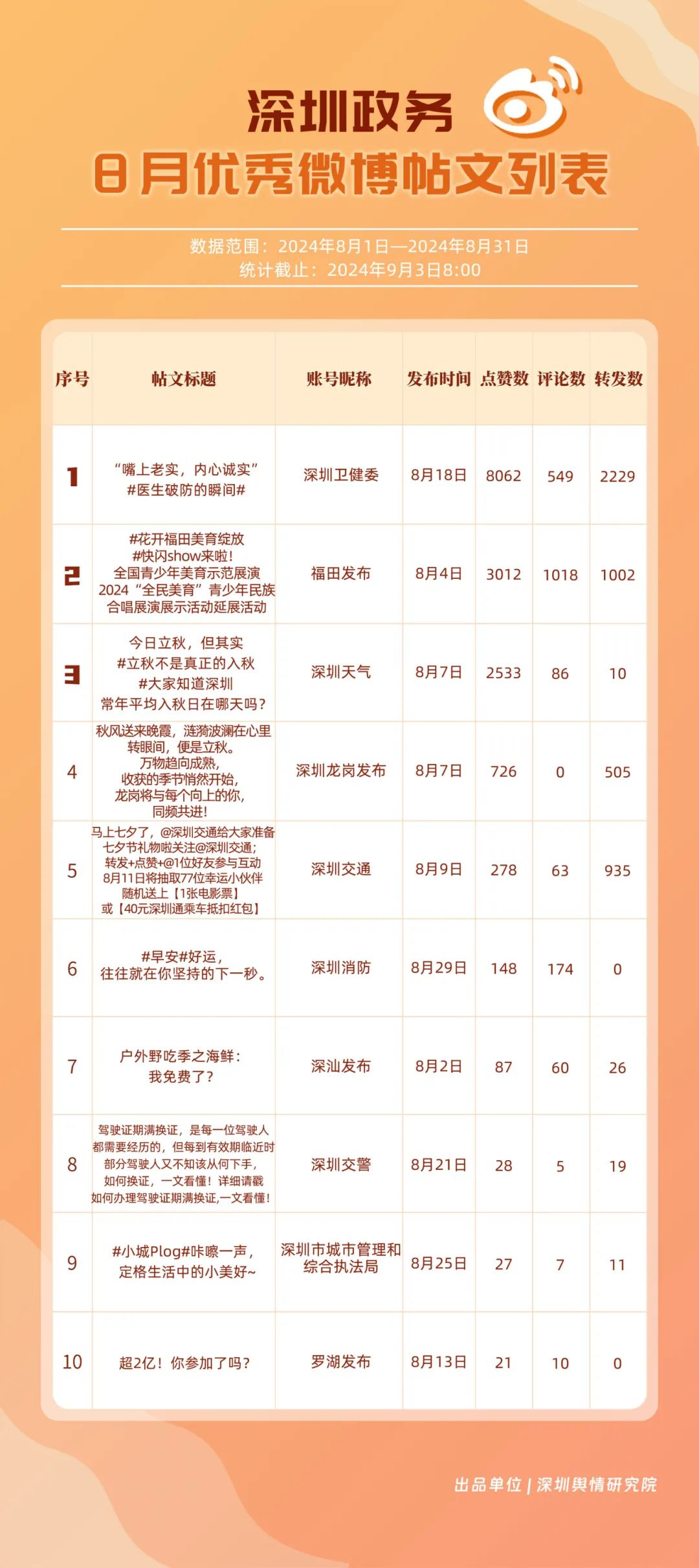 8月,“深圳天氣”“深圳衛(wèi)健委”“深圳消防”“福田發(fā)布”“深圳交警”“深圳龍崗發(fā)布”“深圳應(yīng)急管理”“深圳公安”“深圳交通”“深圳市城市管理和綜合執(zhí)法局”等20個(gè)政務(wù)微博號發(fā)布高質(zhì)量信息,入選優(yōu)秀政務(wù)微博號。其中,“深圳天氣”“深圳衛(wèi)健委”持續(xù)保持領(lǐng)先地位;“深圳消防”“福田發(fā)布”“深圳交警”等賬號有效優(yōu)化發(fā)布內(nèi)容和互動(dòng)策略,排名有所提升。