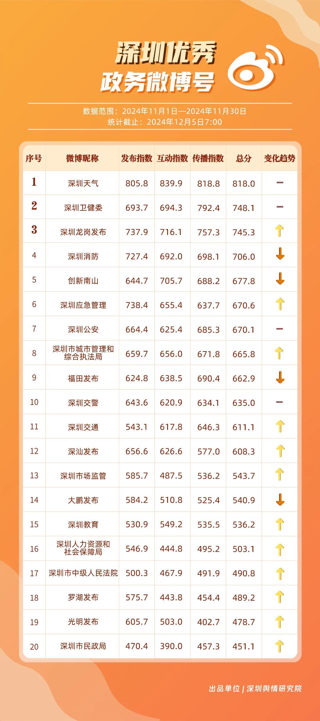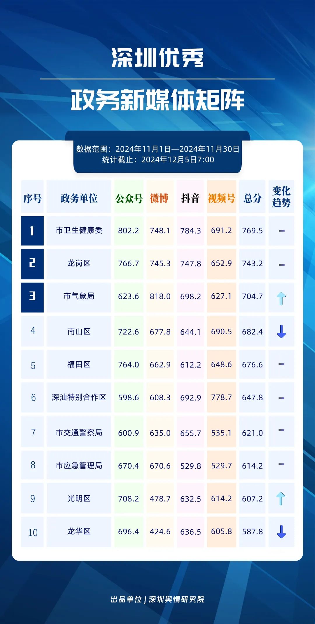 《深圳優(yōu)秀政務(wù)新媒體矩陣》2024年11月榜單揭曉,讓我們一同關(guān)注,哪些新媒體矩陣能夠憑借優(yōu)異表現(xiàn)嶄露新姿,成為加速政務(wù)傳播與服務(wù)創(chuàng)新發(fā)展的先鋒。