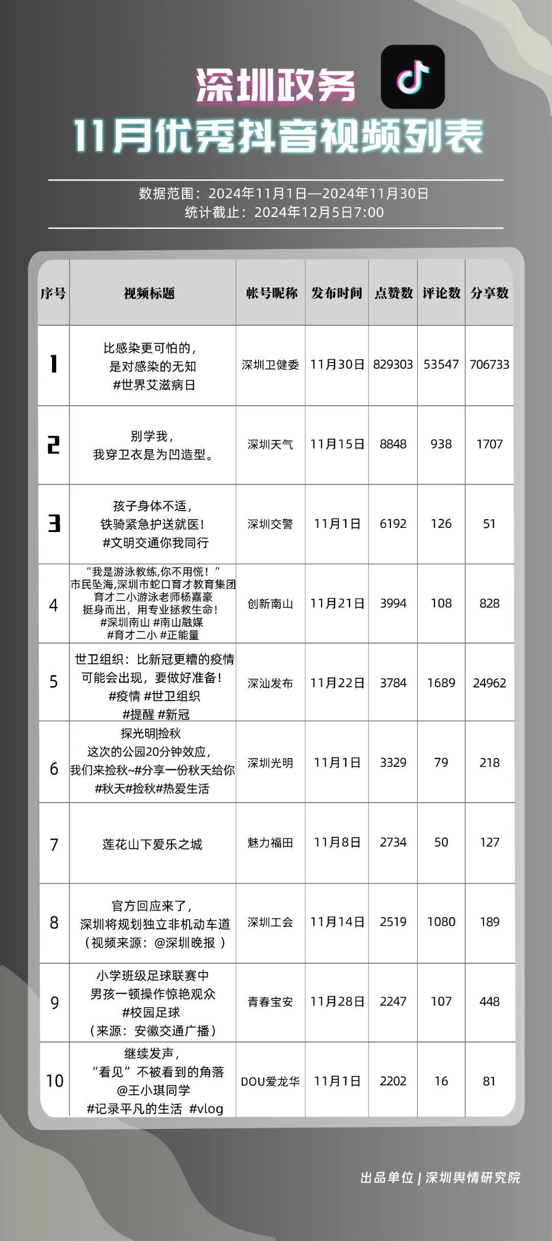 11月,“深圳衛(wèi)健委”“掌上龍崗”“深圳天氣”“深汕發(fā)布”“深圳工會”“深圳交警”“創(chuàng)新南山”“DOU愛龍華”“深圳光明”“中國前海”共10個政務(wù)抖音號獲得“深圳優(yōu)秀政務(wù)抖音號”稱號。“深圳衛(wèi)健委”憑借高質(zhì)量劇情內(nèi)容,巧妙融入健康知識,視頻累計收獲近百萬點(diǎn)贊。同時,“掌上龍崗”和“深圳天氣”也在視頻內(nèi)容創(chuàng)新上不斷探索,通過優(yōu)化宣傳策略和信息傳播方式,使得網(wǎng)民能夠在輕松愉快的氛圍中了解龍崗區(qū)的最新動態(tài)和深圳的天氣信息,展現(xiàn)了政務(wù)抖音號的獨(dú)特魅力與社會影響力。