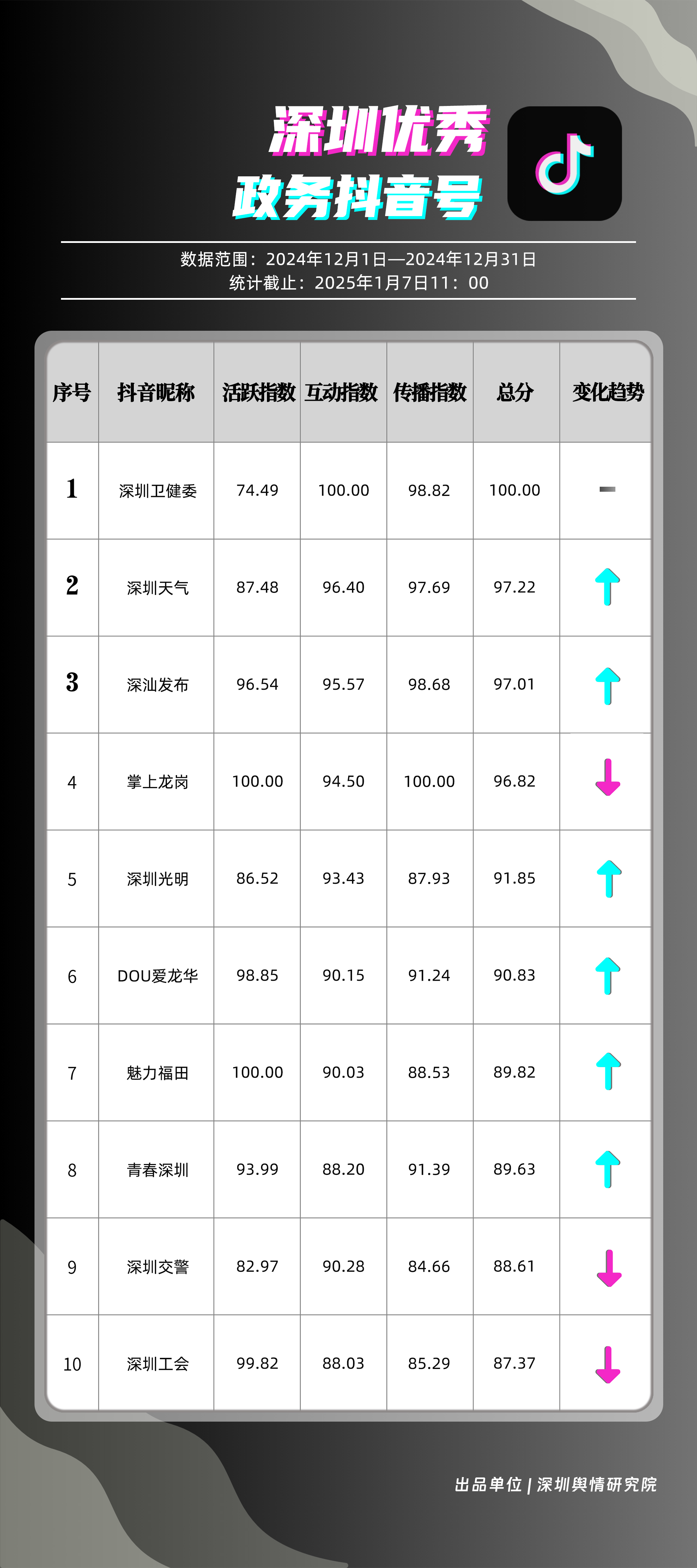 12月,“深圳衛(wèi)健委”“深圳天氣”“深汕發(fā)布”“掌上龍崗”“深圳光明”“DOU愛龍華”“魅力福田”“青春深圳”“深圳交警”“深圳工會(huì)”共10個(gè)政務(wù)抖音號獲得“深圳優(yōu)秀政務(wù)抖音號”稱號。“深圳衛(wèi)健委”在互動(dòng)、傳播方面成績優(yōu)異,助推其位于榜單首位。“深圳天氣”“深汕發(fā)布”“掌上龍崗”則各有所長,綜合排名位于榜單前列,內(nèi)容產(chǎn)出豐富、用戶互動(dòng)高頻,信息傳播廣泛,共同展現(xiàn)了政務(wù)抖音號在服務(wù)公眾、提升信息傳播效能方面的顯著效能。