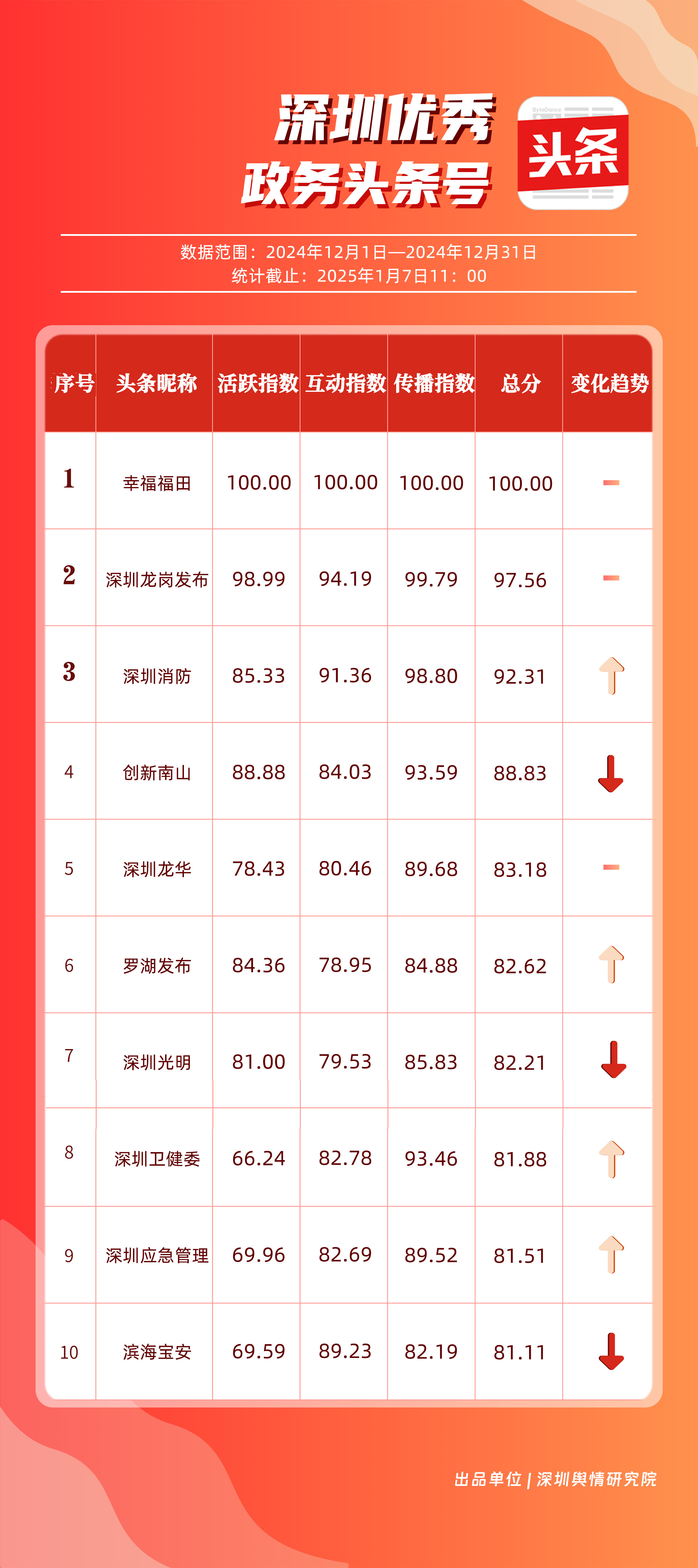 12月,“幸福福田”“深圳龍崗發(fā)布”“深圳消防”“創(chuàng)新南山”“深圳龍華”“羅湖發(fā)布”“深圳光明”“深圳衛(wèi)健委”“深圳應(yīng)急管理”“濱海寶安”共10個(gè)政務(wù)頭條號入選“優(yōu)秀政務(wù)頭條號”榜單。對比其他賬號,“幸福福田”在各方面均取得較好成績,居于榜單第一位置。“深圳龍崗發(fā)布”以97.56分位于榜單第二名,其傳播指數(shù)得分為99.79分,反映出賬號在信息傳播范圍方面存在明顯優(yōu)勢。此外,賬號“深圳消防”“創(chuàng)新南山”“深圳龍華”也為市民提供便捷、高效的政務(wù)信息,位于榜單前五名。