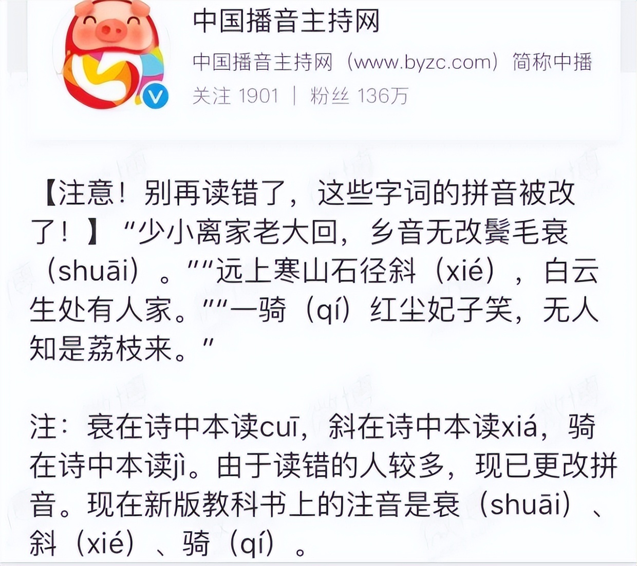 中國播音主持網就科普了很多被修訂的讀音