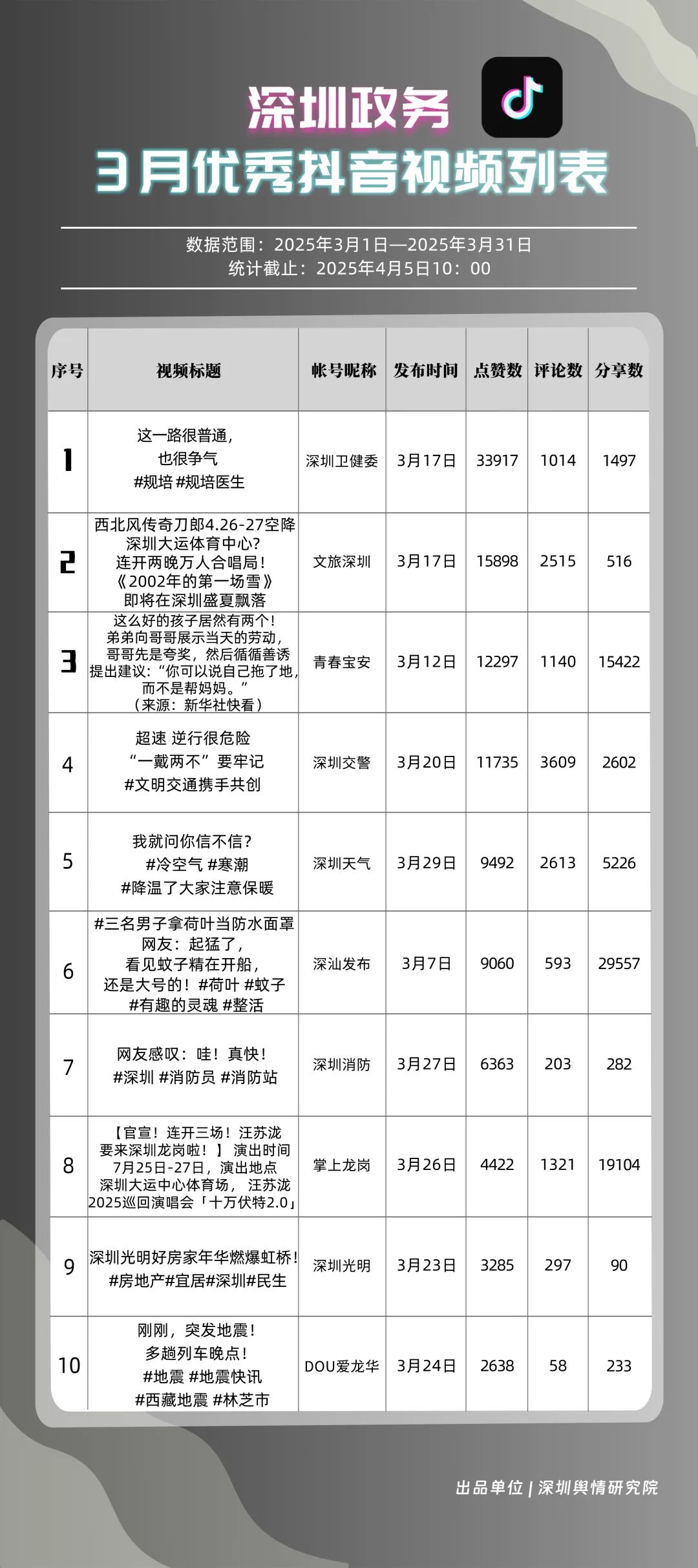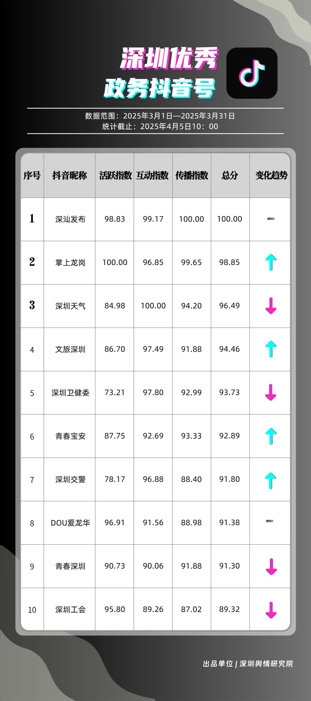 3月,“深汕發(fā)布”“掌上龍崗”“深圳天氣”“文旅深圳”“深圳衛(wèi)健委”“青春寶安”“深圳交警”“DOU愛龍華”“青春深圳”“深圳工會”共10個政務抖音號獲得“深圳優(yōu)秀政務抖音號”稱號。其中,“深汕發(fā)布”位于榜單第一名,3月共收獲5萬余次點贊、8萬余次轉發(fā),反映出賬號作品的較高吸引力;“深圳龍崗”以98.85分位于榜單第二名,與榜首分差微小,整體實力不俗。緊隨其后的分別是“深圳天氣”“文旅深圳”“深圳衛(wèi)健委”,三賬號產出內容優(yōu)質,也獲得較高評分。相關上榜單位展現(xiàn)了深圳政務新媒體賬號在短視頻傳播領域的創(chuàng)新探索力與傳播實效性。