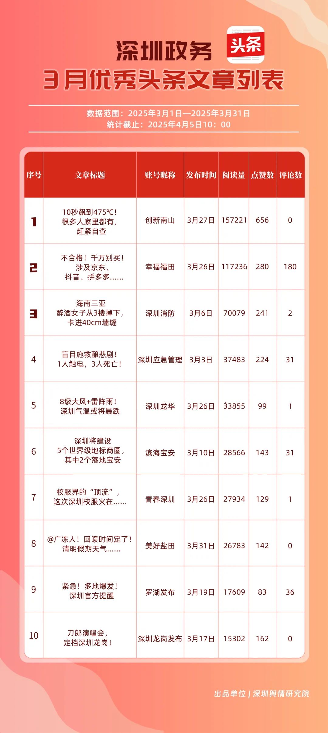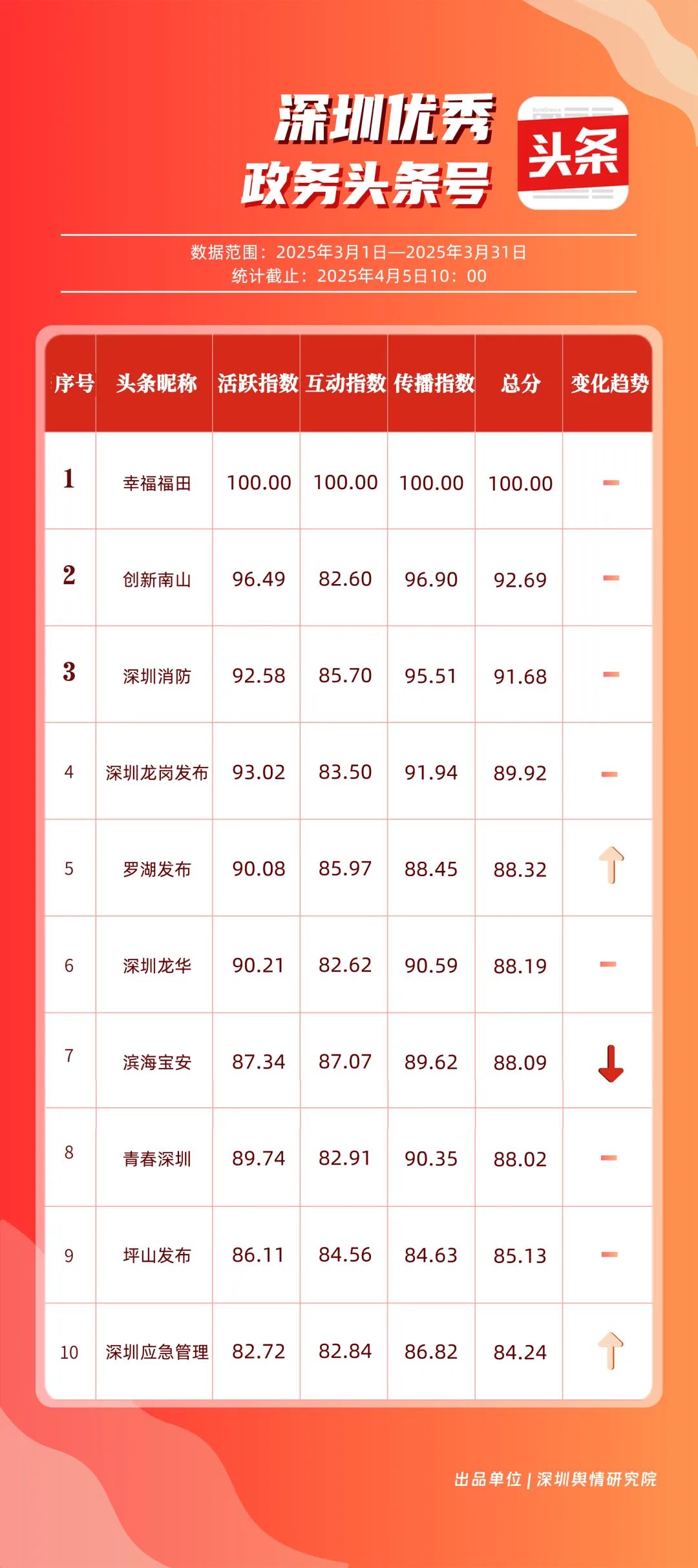 3月,“幸福福田”“創(chuàng)新南山”“深圳消防”“深圳龍崗發(fā)布”“羅湖發(fā)布”“深圳龍華”“濱海寶安”“青春深圳”“坪山發(fā)布”“深圳應急管理”共10個政務頭條號入選“優(yōu)秀政務頭條號”榜單。上榜賬號中,“幸福福田”“創(chuàng)新南山”“深圳消防”“深圳龍崗發(fā)布”在頭條平臺排名較為穩(wěn)固,排名未產生變動。當月,“深圳應急管理”以84.24分躋身榜單前十。