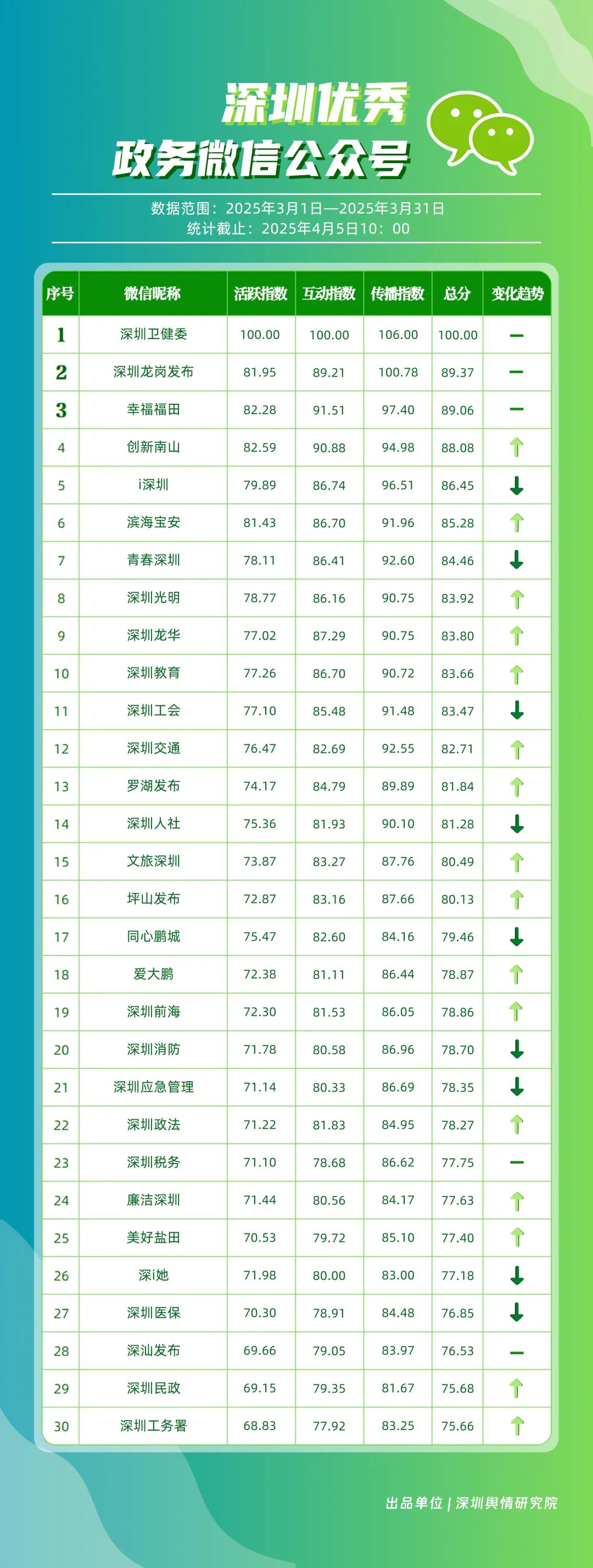 3月,市衛(wèi)生健康委、龍崗區(qū)、市氣象局、深汕特別合作區(qū)、南山區(qū)、福田區(qū)、市應急管理局、龍華區(qū)、寶安區(qū)、光明區(qū)榮登“深圳優(yōu)秀政務新媒體矩陣”榜單。3月,市衛(wèi)生健康委新媒體矩陣持續(xù)關注市民身心健康,發(fā)布健康科普內容,穩(wěn)居榜單第一位;龍崗區(qū)新媒體矩陣在抖音、微信視頻號平臺發(fā)力宣傳,躍居榜單第二位;市氣象局新媒體矩陣在微博平臺連續(xù)多期獲得滿分,持續(xù)以氣象預警與生活指南結合的內容模式,為市民帶來便利信息。以上賬號在“深圳優(yōu)秀政務新媒體矩陣”榜單中榮獲前三名。此外,深汕特別合作區(qū)新媒體矩陣積極發(fā)布網絡熱點內容,收獲較多網民關注分享;南山區(qū)新媒體矩陣多平臺實力強勁,以88.37分居于榜單第五位。值得關注的是,寶安區(qū)新媒體矩陣時隔多期躋身榜單前十名,多平臺均衡發(fā)展成效初顯。
