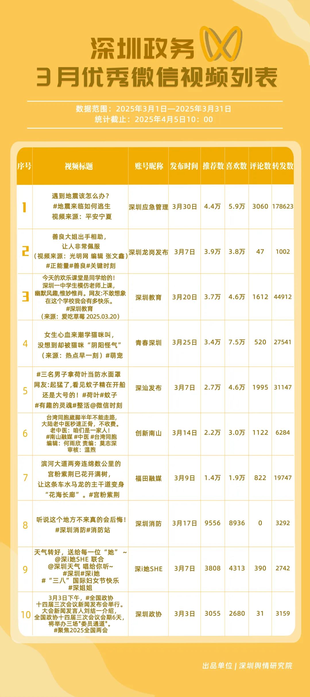 3月,獲“深圳優(yōu)秀政務微信視頻號”稱號的分別是“深圳應急管理”“深圳教育”“深汕發(fā)布”“青春深圳”“創(chuàng)新南山”“福田融媒”“深圳龍崗發(fā)布”“深圳光明”“文旅深圳”“深圳天氣”。其中,“深圳應急管理”以20余篇作品收獲超20萬次轉發(fā),躍居第一名,一期有關“地震來臨如何逃生”的視頻收獲超17萬次轉發(fā),展現(xiàn)了其內容的高實用性。“深圳教育”“深汕發(fā)布”位于榜單第二、三位,總分超90分,反映出兩賬號在民生教育、區(qū)域宣傳領域擁有較好傳播效果。“青春深圳”“創(chuàng)新南山”“福田融媒”等賬號也在3月發(fā)布優(yōu)質視頻內容,展現(xiàn)了深圳政務新媒體在視頻號平臺宣傳的創(chuàng)新探索。