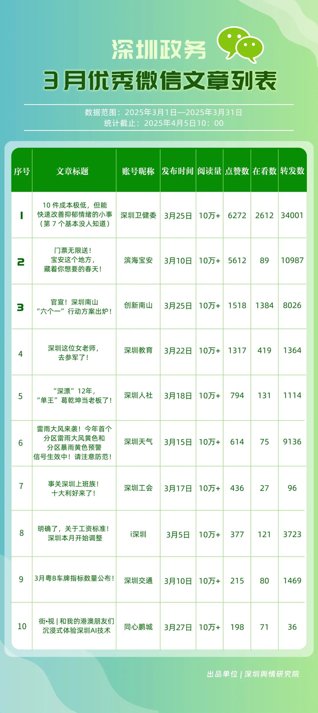 3月,包括“深圳衛(wèi)健委”“深圳龍崗發(fā)布”“幸福福田”“創(chuàng)新南山”“i深圳”“濱海寶安”“青春深圳”“深圳光明”“深圳龍華”“深圳教育”等在內的30個賬號入選“深圳優(yōu)秀政務微信公眾號”。其中,“深圳衛(wèi)健委”超70篇文章閱讀量達10萬次以上,穩(wěn)居榜單首位;“深圳龍崗發(fā)布”也取得較好傳播效果,在3月產出10余篇閱讀量超10萬次的熱門文章,位于榜單第二位;“幸福福田”也積極發(fā)布高質量內容,穩(wěn)住榜單第三位置;緊隨其后的是“創(chuàng)新南山”“i深圳”“濱海寶安”,總分均在85分以上。這充分展現(xiàn)了深圳新媒體傳播生態(tài)體系中,各主體的傳播優(yōu)勢與影響力版圖正逐漸凸顯。