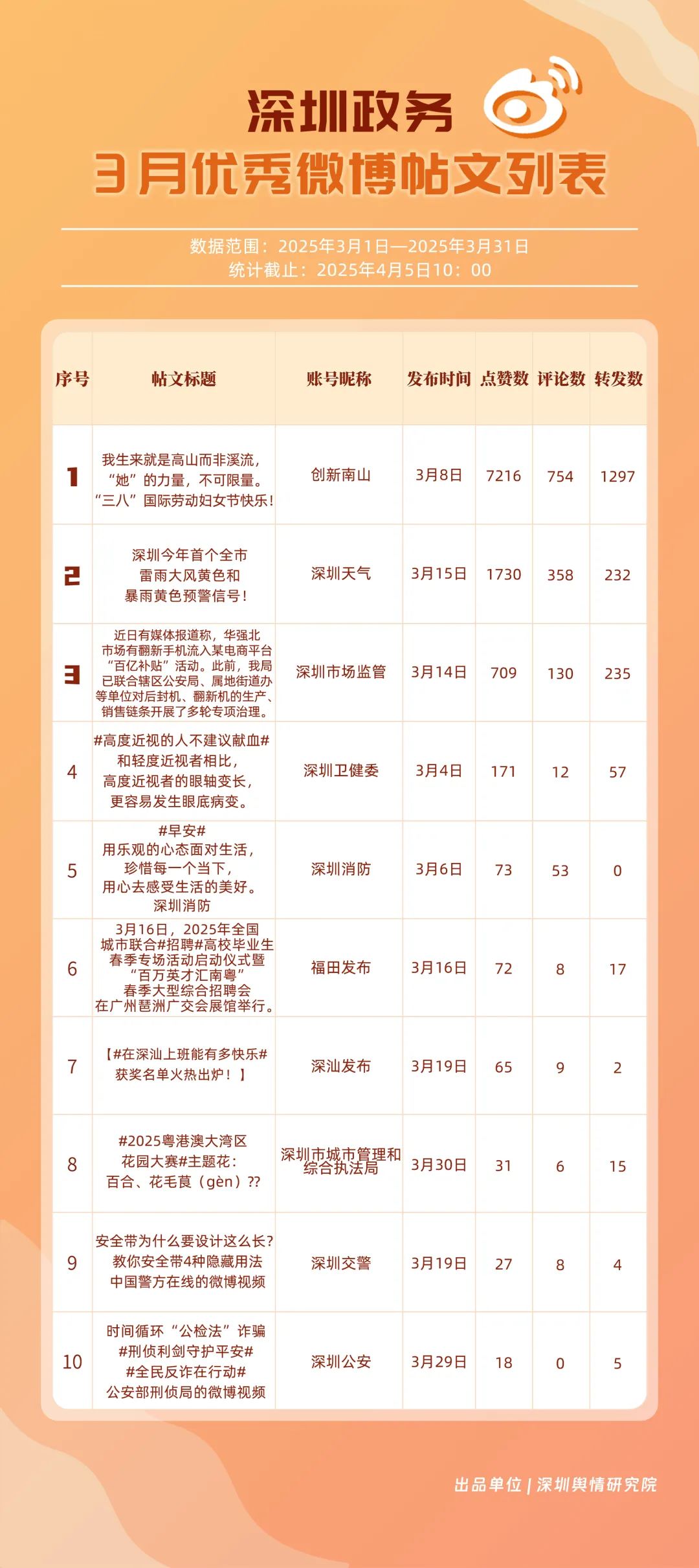 3月,“深圳天氣”“創(chuàng)新南山”“深圳衛(wèi)健委”“深圳消防”“福田發(fā)布”“深圳應急管理”“深圳公安”“深圳市場監(jiān)管”“深圳龍崗發(fā)布”“深圳市城市管理和綜合執(zhí)法局”等20個賬號入選“優(yōu)秀政務微博號”。值得一提的是,“深圳天氣”賬號在3月共獲得點贊超11萬,相較其他賬號具備顯著優(yōu)勢。“創(chuàng)新南山”“深圳衛(wèi)健委”“深圳消防”也位列前茅,分差微小,競爭激烈。從領域分布來看,上榜賬號不僅包括區(qū)級賬號,還涵蓋民生服務、應急科普、城市治理等單位賬號,體現(xiàn)了深圳政務新媒體在多領域的強大影響力。