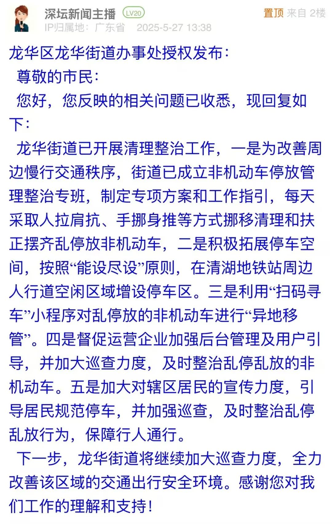 案例點評:地鐵口電動車與共享單車堆積,既阻礙行人通行,更影響區域交通秩序與城市形象。龍華街道辦接訴后迅速響應,成立專項整治專班,通過每日清理扶正、增設停車區、“掃碼尋車”移管、督促企業巡查及居民宣傳引導等多維度舉措,破解亂停難題,以“疏堵結合”的治理智慧,快速行動,綜合施策,為改善區域交通環境提供了務實范本。
