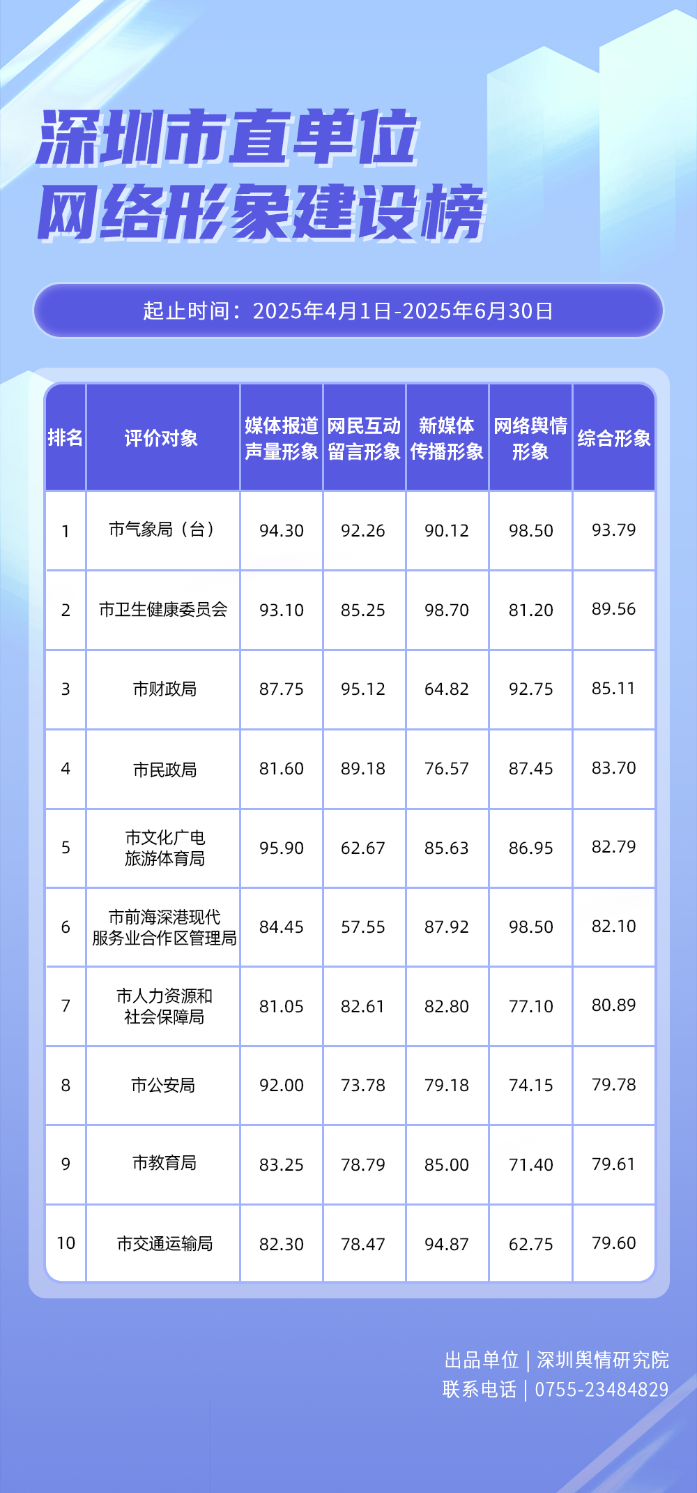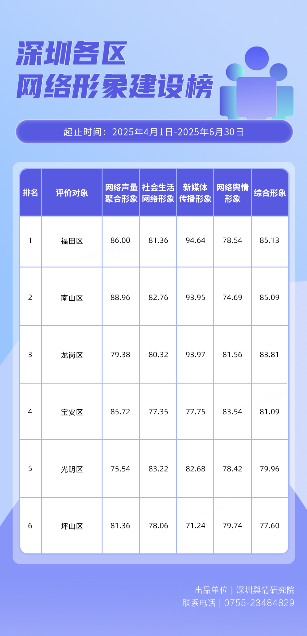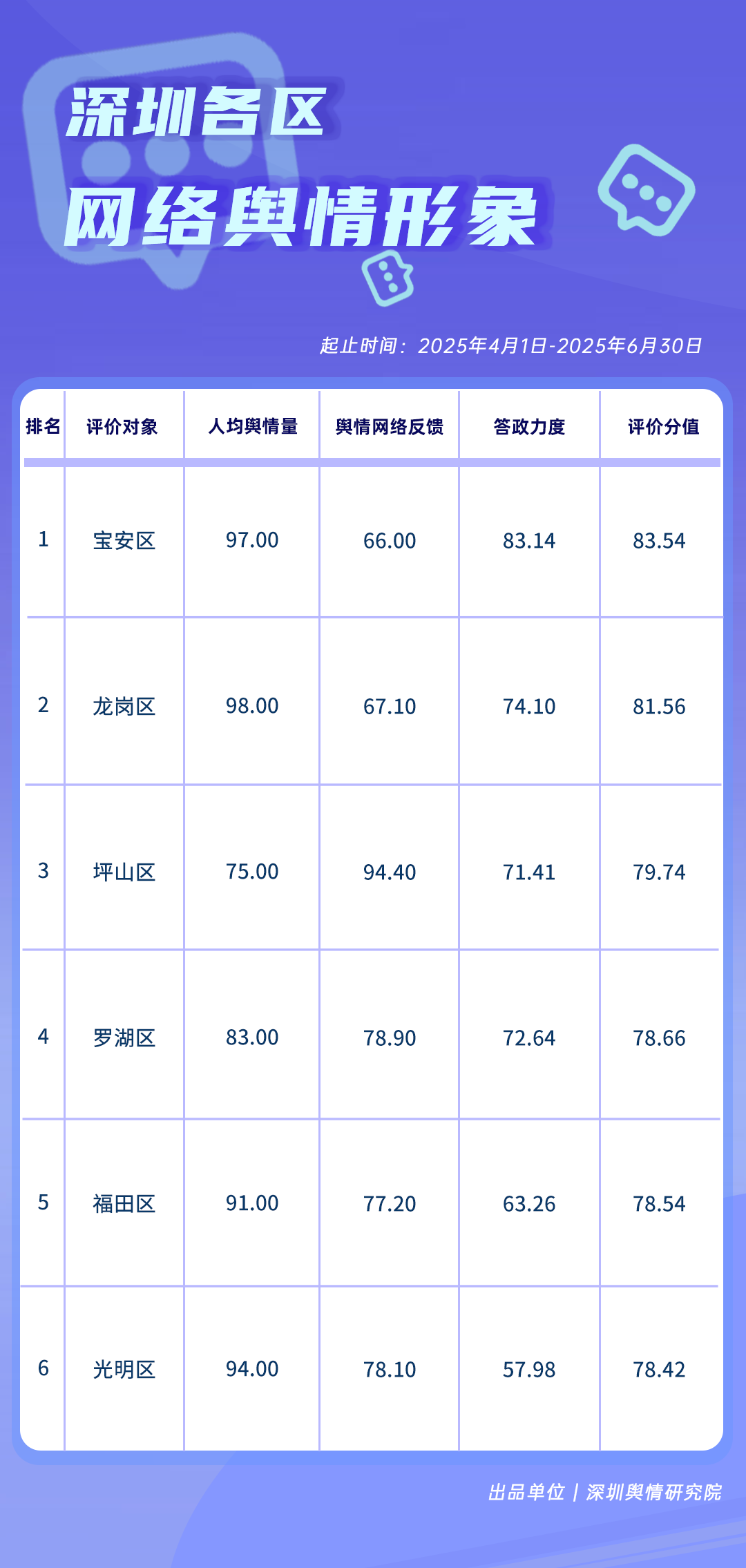 為全面評估深圳各區各單位網絡形象建設情況,助力各區各單位持續響應居民對美好生活的期許,賦能城市高質量發展,深圳輿情研究院推出“深圳各區各單位網絡形象建設榜”,從網絡聚合聲量、留言互動成效、社會生活評價、輿情管理能力及新媒體傳播水平等方面,多維度分析深圳各區(含大鵬新區、深汕特別合作區)、各市直單位(市直屬單位、直屬部門)的網絡形象建設成果,凸顯各區各單位的“共性”與“個性”。