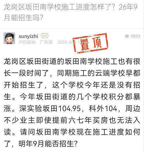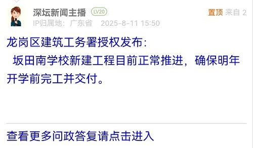 23. 帖文《龍崗區坂田南學校施工進度怎樣了?26年9月能招生嗎?》