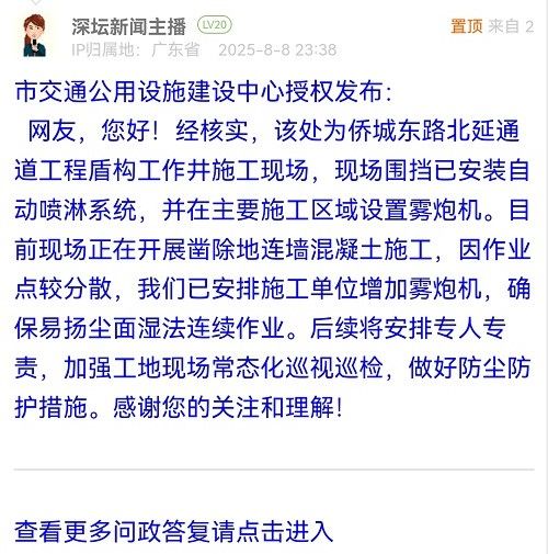 網友,您好!經核實,該處為僑城東路北延通道工程盾構工作井施工現場,現場圍擋已安裝自動噴淋系統,并在主要施工區域設置霧炮機。目前現場正在開展鑿除地連墻混凝土施工,因作業點較分散,我們已安排施工單位增加霧炮機,確保易揚塵面濕法連續作業。后續將安排專人專責,加強工地現場常態化巡視巡檢,做好防塵防護措施。感謝您的關注和理解!