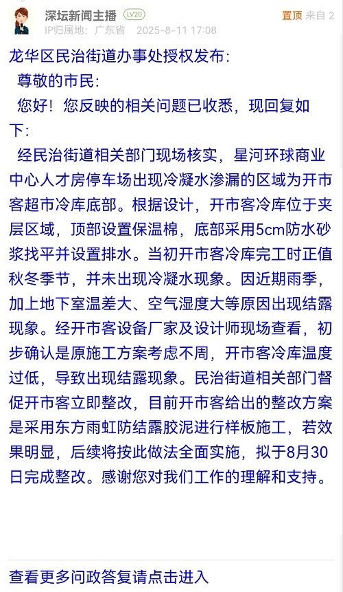經民治街道相關部門現場核實,星河環球商業中心人才房停車場出現冷凝水滲漏的區域為開市客超市冷庫底部。根據設計,開市客冷庫位于夾層區域,頂部設置保溫棉,底部采用5cm防水砂漿找平并設置排水。當初開市客冷庫完工時正值秋冬季節,并未出現冷凝水現象。因近期雨季,加上地下室溫差大、空氣濕度大等原因出現結露現象。經開市客設備廠家及設計師現場查看,初步確認是原施工方案考慮不周,開市客冷庫溫度過低,導致出現結露現象。民治街道相關部門督促開市客立即整改,目前開市客給出的整改方案是采用東方雨虹防結露膠泥進行樣板施工,若效果明顯,后續將按此做法全面實施,擬于8月30日完成整改。感謝您對我們工作的理解和支持。