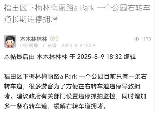 27. 帖文《福田區下梅林梅麗路a?Park?一個公園右轉車道長期違停擁堵》