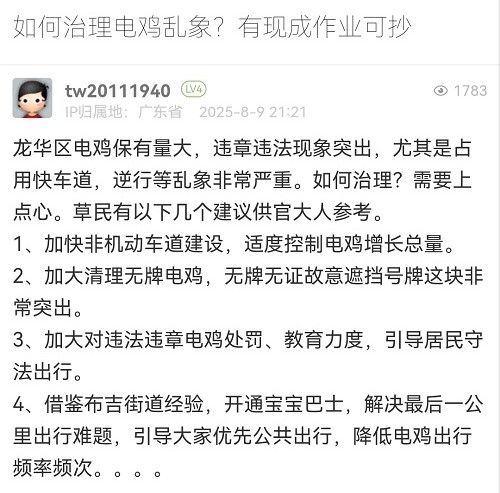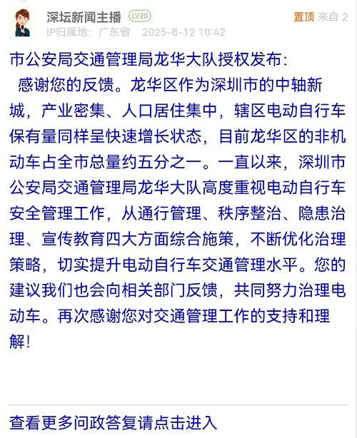 感謝您的反饋。龍華區作為深圳市的中軸新城,產業密集、人口居住集中,轄區電動自行車保有量同樣呈快速增長狀態,目前龍華區的非機動車占全市總量約五分之一。一直以來,深圳市公安局交通管理局龍華大隊高度重視電動自行車安全管理工作,從通行管理、秩序整治、隱患治理、宣傳教育四大方面綜合施策,不斷優化治理策略,切實提升電動自行車交通管理水平。您的建議我們也會向相關部門反饋,共同努力治理電動車。再次感謝您對交通管理工作的支持和理解!