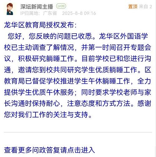 您好,您反映的問題已收悉。龍華區外國語學校已主動調查了解情況,并第一時間召開專題會議,積極研究躺睡工作。目前學校已和您進行溝通,邀請您到校共同研究學生優質躺睡工作。區教育局已督促學校推進學生午休躺睡工作,全力提供學生優質午休服務;同時要求學校老師與家長溝通時保持耐心,注意態度和方式方法。感謝您對我們工作的關注與支持。