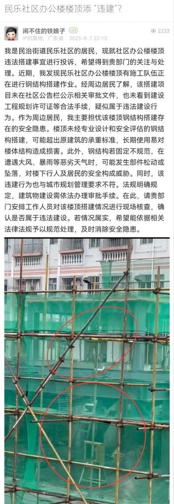 19. 帖文《民樂社區辦公樓樓頂添 “違建”?》