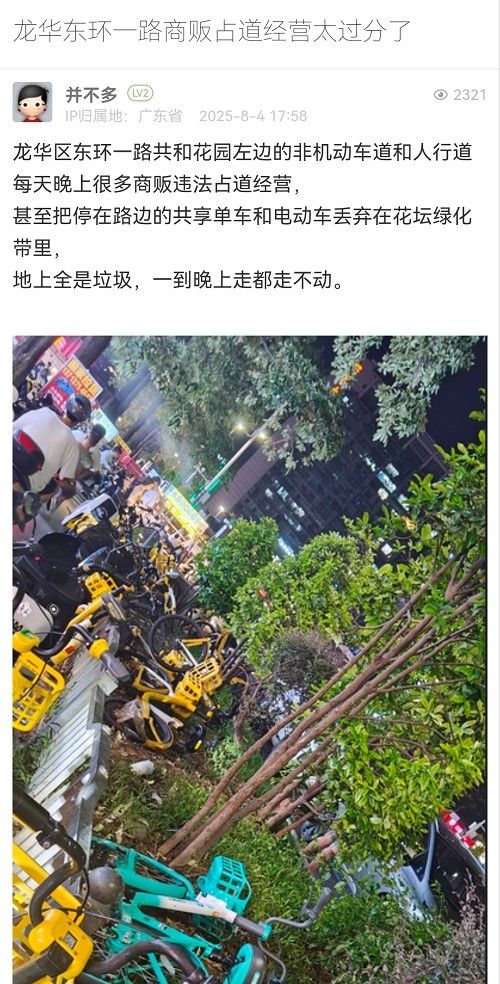 您好,您反映的問題已收悉。8月4日晚,我街道工作人員已到共和花園門口開展清理整治工作,現場對攤販進行勸導教育,要求其務必遵守《深圳經濟特區市容和環境衛生管理條例》相關規定,不得擅自占用城市道路擺攤設點、銷售商品,避免影響周邊居民正常生活。同時,街道工作人員已將亂停亂扔的非機動車進行清理挪移,并已督促共享單車運營企業需及時清理亂停亂放的車輛和停止無序投放行為。此外,街道已督促環衛企業清理路邊商販殘留的垃圾,并對該區域進行清理和沖洗,進一步加強日常清掃保潔。為固化整治成效,街道已安排工作人員在該處進行定點值守,如發現占道經營問題回潮,將及時進行勸導。