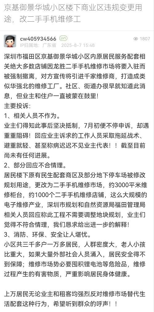 18. 帖文《京基御景華城小區樓下商業區違規變更用途,改二手手機維修工》