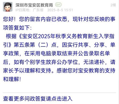 根據《寶安區2025年秋季義務教育新生入學指引》第五條第(二)點,因實行共享、分享、單享政策,在采用電腦錄取結束并公告錄取名單后,如有個別學生放棄公辦學位,無法遞補,請家長予以理解和支持。感謝您對寶安教育的支持和理解!