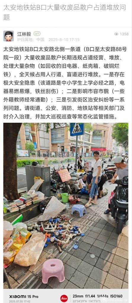 尊敬的市民:您好!您反映的問題我隊已收悉。收到情況后,我隊高度重視,第一時間安排工作人員前往現場核實,相關處置情況如下:8月11日,我隊工作人員對太安地鐵站B口及周邊開展巡查,暫未發現占道回收廢品的人員。鑒于流動收廢品人員無固定回收時間和攤位,我隊已安排工作人員在太安地鐵站B口周邊分時段值守,若發現相關占道經營人員,將立即予以勸離。對于不配合勸導的相關人員,將予以暫扣經營工具等措施。感謝您對城市管理工作的理解與支持!