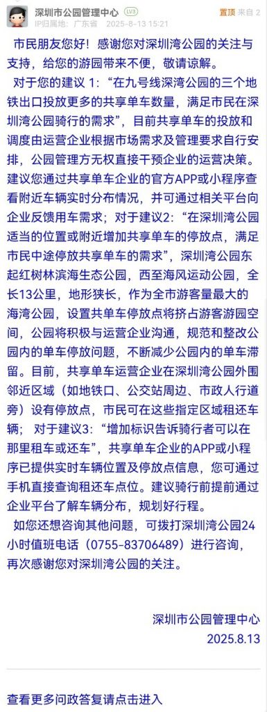 對于您的建議 1:“在九號線深灣公園的三個地鐵出口投放更多的共享單車數量,滿足市民在深圳灣公園騎行的需求”,目前共享單車的投放和調度由運營企業根據市場需求及管理要求自行安排,公園管理方無權直接干預企業的運營決策。建議您通過共享單車企業的官方APP或小程序查看附近車輛實時分布情況,并可通過相關平臺向企業反饋用車需求;對于建議2:“在深圳灣公園適當的位置或附近增加共享單車的停放點,滿足市民中途停放共享單車的需求”,深圳灣公園東起紅樹林濱海生態公園,西至海風運動公園,全長13公里,地形狹長,作為全市游客量最大的海灣公園,設置共單車停放點將擠占游客游園空間,公園將積極與運營企業溝通,規范和整改公園內的單車停放問題,不斷減少公園內的單車滯留。目前,共享單車運營企業在深圳灣公園外圍鄰近區域(如地鐵口、公交站周邊、市政人行道旁)設有停放點,市民可在這些指定區域租還車輛; 對于建議3:“增加標識告訴騎行者可以在那里租車或還車”,共享單車企業的APP或小程序已提供實時車輛位置及停放點信息,您可通過手機直接查詢租還車點位。建議騎行前提前通過企業平臺了解車輛分布,規劃好行程。