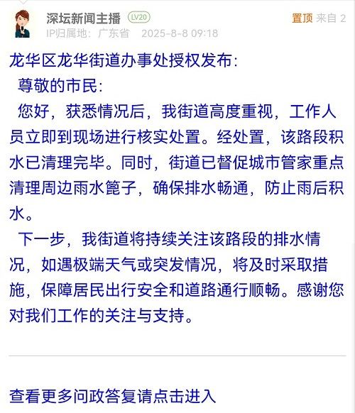 您好,獲悉情況后,我街道高度重視,工作人員立即到現場進行核實處置。經處置,該路段積水已清理完畢。同時,街道已督促城市管家重點清理周邊雨水篦子,確保排水暢通,防止雨后積水。