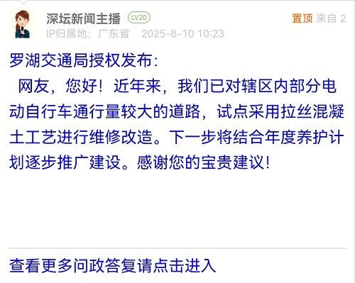 網友,您好!近年來,我們已對轄區內部分電動自行車通行量較大的道路,試點采用拉絲混凝土工藝進行維修改造。下一步將結合年度養護計劃逐步推廣建設。感謝您的寶貴建議!