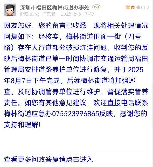 網友您好,您的留言已收悉,現將相關處理情況回復如下:經核實,梅林街道圍面一街(四號路)存在人行道部分破損坑洼問題,收到您的反映后梅林街道已第一時間協調市交通運輸局福田管理局安排道路養護單位進行修復,并于2025年8月7日下午完成。后續梅林街道將加強巡查,及時協調管養單位進行維護,督促落實管養責任。如您有其他意見建議,歡迎直接電話聯系梅林街道應急辦075523996865反映,感謝您的支持和理解!