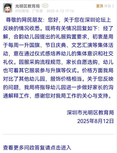尊敬的網民朋友:您好,關于您在深圳論壇上反映的情況收悉。現將有關情況回復如下:經了解,合韻幼兒園提出的禮服購置要求,初衷是用于每周一升國旗、節日慶典、文藝匯演等集體活動,意在通過儀式感培養幼兒的集體意識和社交禮儀。園服采購流程規范,家長自愿選購,幼兒也可著其它服裝參與升旗等儀式。價格方面我局對比了其他幼兒園,服飾價格相當。關于您反映的問題,我局將指導幼兒園進一步做好家長的溝通解釋工作,感謝您對我局工作的關心與支持。