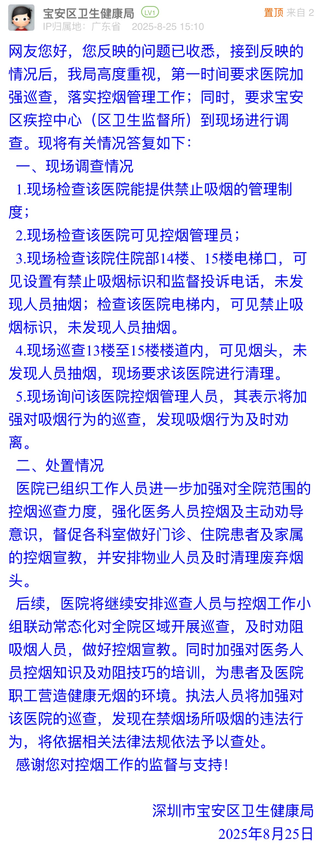 優(yōu)化建議:接到市民反饋后,寶安區(qū)衛(wèi)生健康局快速組織現(xiàn)場調(diào)查,核實醫(yī)院有禁煙制度、控?zé)煿芾韱T在崗,基礎(chǔ)控?zé)煷胧┖瞬榈轿唬档命c贊。但回應(yīng)中多次強調(diào)“未發(fā)現(xiàn)人員抽煙”,回避對歷史吸煙行為處置、煙頭來源及勸阻機制失效的解釋,與市民關(guān)切脫節(jié),難以消除市民對醫(yī)院日常控?zé)熌芰Φ膿?dān)憂,建議完善具體控?zé)煷胧缂友b煙感報警裝置,建立核查公示制度等,筑牢“無煙醫(yī)院”防線。