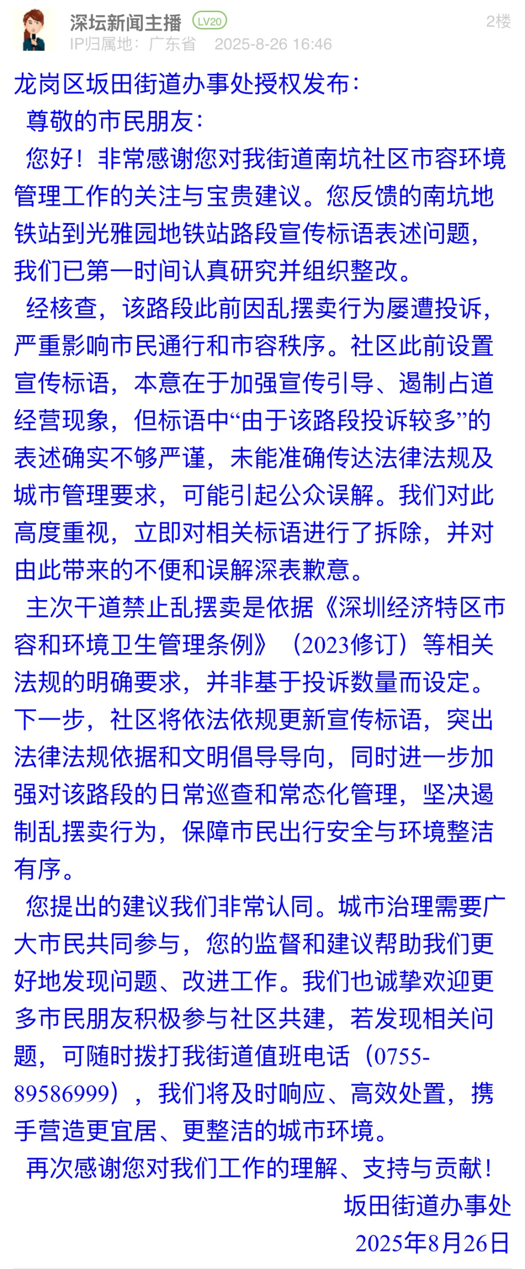 案例點評:標語表述不嚴謹可能引發(fā)公眾誤解,坂田街道辦展現(xiàn)出高效務(wù)實的態(tài)度,第一時間拆除涉事標語,計劃更新標語,明確標語中提及的禁擺依據(jù)為法規(guī)要求而非投訴數(shù)量。回應(yīng)中,街道主動致歉并公開整改邏輯,展現(xiàn)“直面問題不推諉”的擔(dān)當(dāng),更以“邀請市民參與共建”為切入點,構(gòu)建“政府主導(dǎo)+公眾監(jiān)督”的治理閉環(huán)。此次整改有效化解因標語表述不當(dāng)引發(fā)的公眾疑慮,彰顯了“以民為師”的共治智慧。