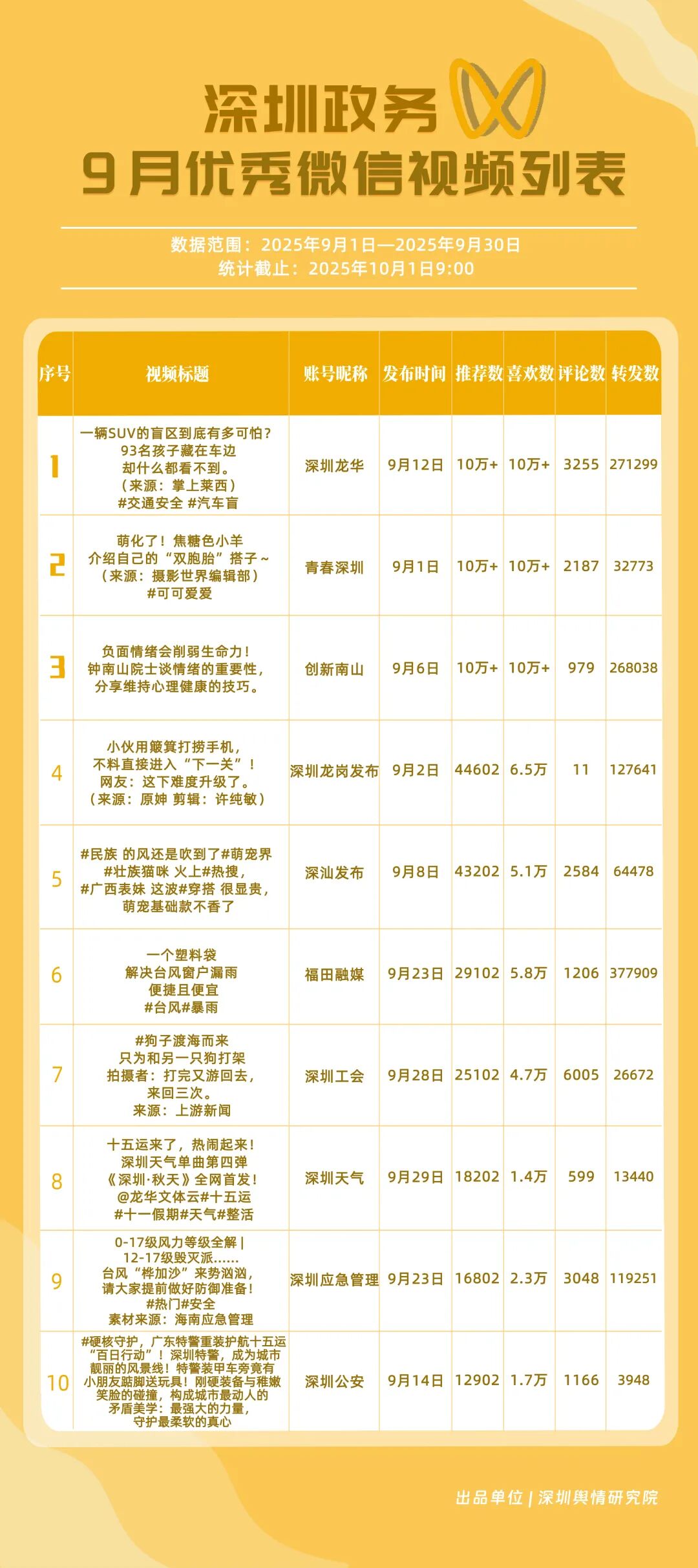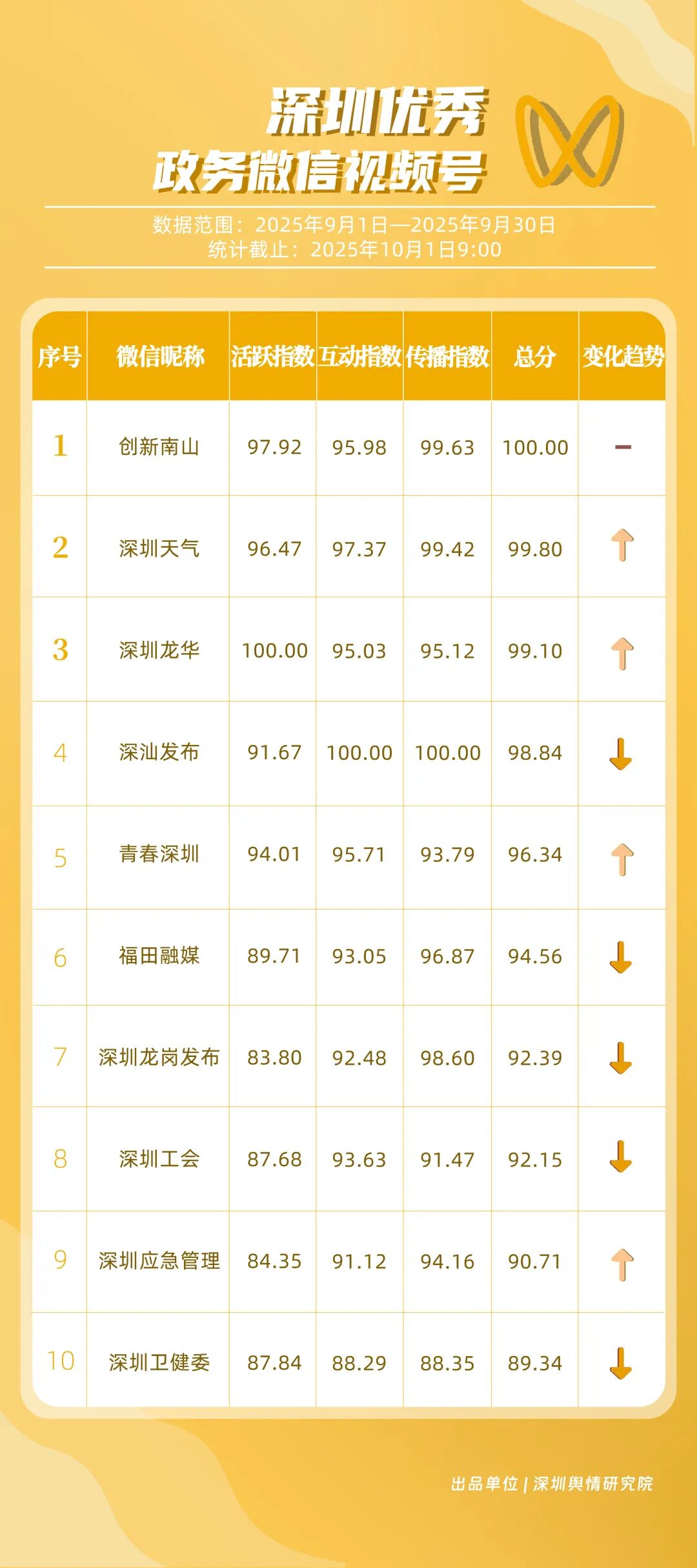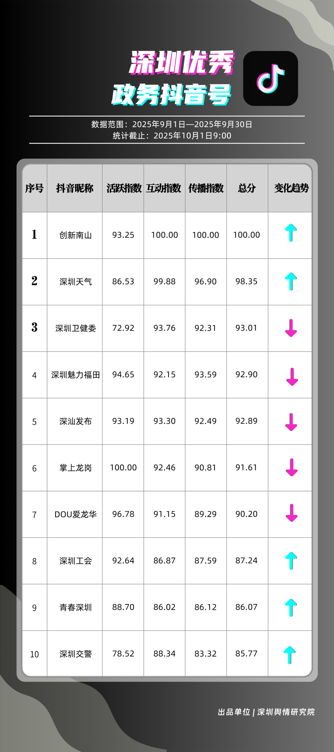 9月,深圳政務新媒體矩陣持續優化內容生態,各單位依托平臺特色深化服務效能,南山區、市衛生健康委員會、市氣象局(臺)、龍崗區、福田區、龍華區、深汕特別合作區、市應急管理局、中國共產主義青年團深圳市委員會、光明區的新媒體矩陣入選“深圳優秀政務新媒體矩陣”榜單。9月,南山區在短視頻平臺表現突出,抖音、微信視頻號平臺均獲滿分;市衛生健康委員會輸出深度內容,位列榜單第二;市氣象局(臺)新媒體矩陣居于榜單第三,在9月發布臺風相關天氣提醒,獲得公眾廣泛關注。此外,龍崗區、福田區、龍華區、深汕特別合作區新媒體矩陣持續推出優質內容,共同展現了深圳在塑造現代化形象、提升數字治理能力上的創新引領作用。