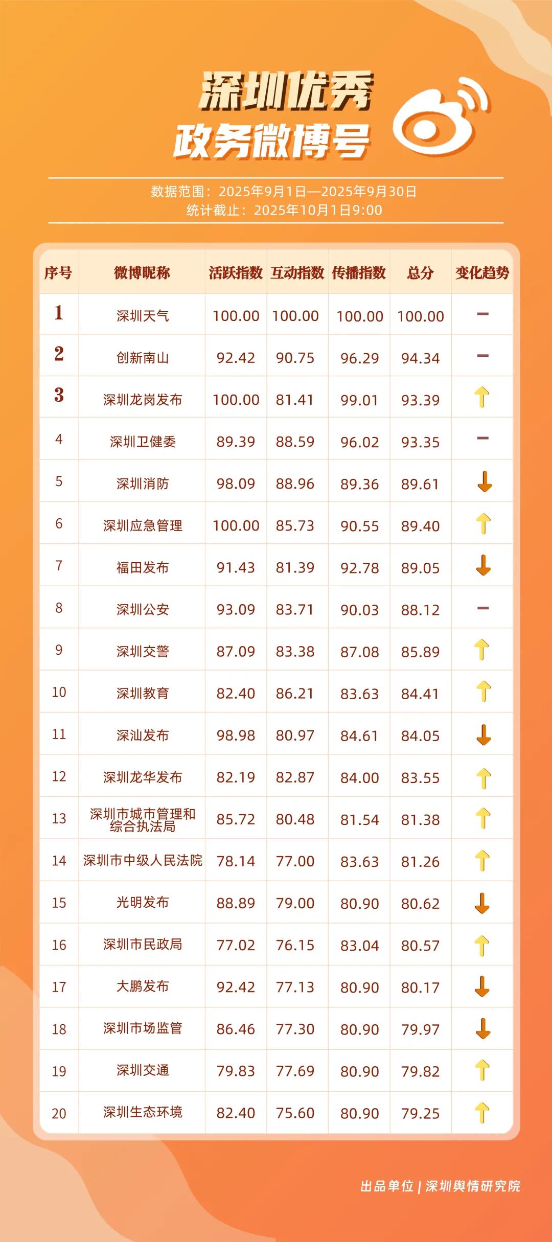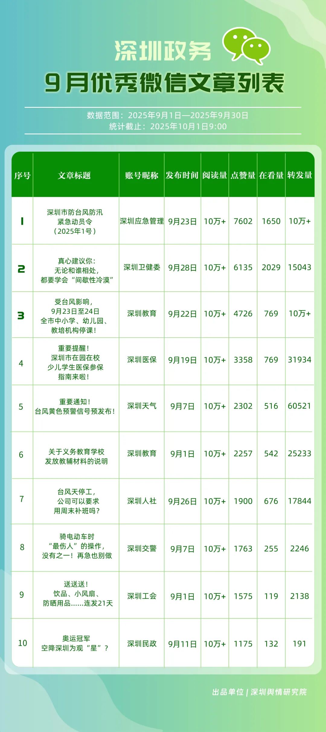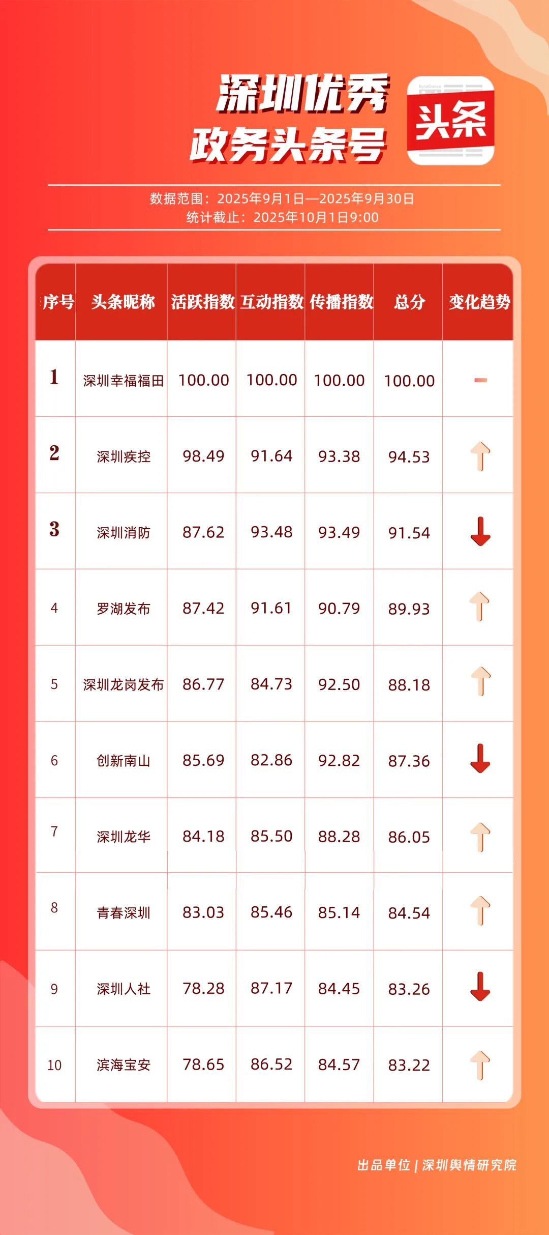 9月,深圳政務新媒體矩陣持續優化內容生態,各單位依托平臺特色深化服務效能,南山區、市衛生健康委員會、市氣象局(臺)、龍崗區、福田區、龍華區、深汕特別合作區、市應急管理局、中國共產主義青年團深圳市委員會、光明區的新媒體矩陣入選“深圳優秀政務新媒體矩陣”榜單。9月,南山區在短視頻平臺表現突出,抖音、微信視頻號平臺均獲滿分;市衛生健康委員會輸出深度內容,位列榜單第二;市氣象局(臺)新媒體矩陣居于榜單第三,在9月發布臺風相關天氣提醒,獲得公眾廣泛關注。此外,龍崗區、福田區、龍華區、深汕特別合作區新媒體矩陣持續推出優質內容,共同展現了深圳在塑造現代化形象、提升數字治理能力上的創新引領作用。
