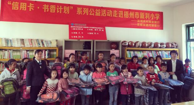2016年,由深圳農商行發起的“信用卡公益計劃·書香圖書室”捐贈活動,深入走進廣西壯族自治區的偏遠山區,為當地較為貧困的學校學生送去溫暖。此次活動為當地的中村小學、合林小學及龍降小學捐贈各類圖書共計2217本、文具6665套、書包153個、書桌書柜椅子共115個、體育用品108套,有效地幫助這三所小學建設完整的圖書室,為學生們創造良好的閱讀環境。[詳細]